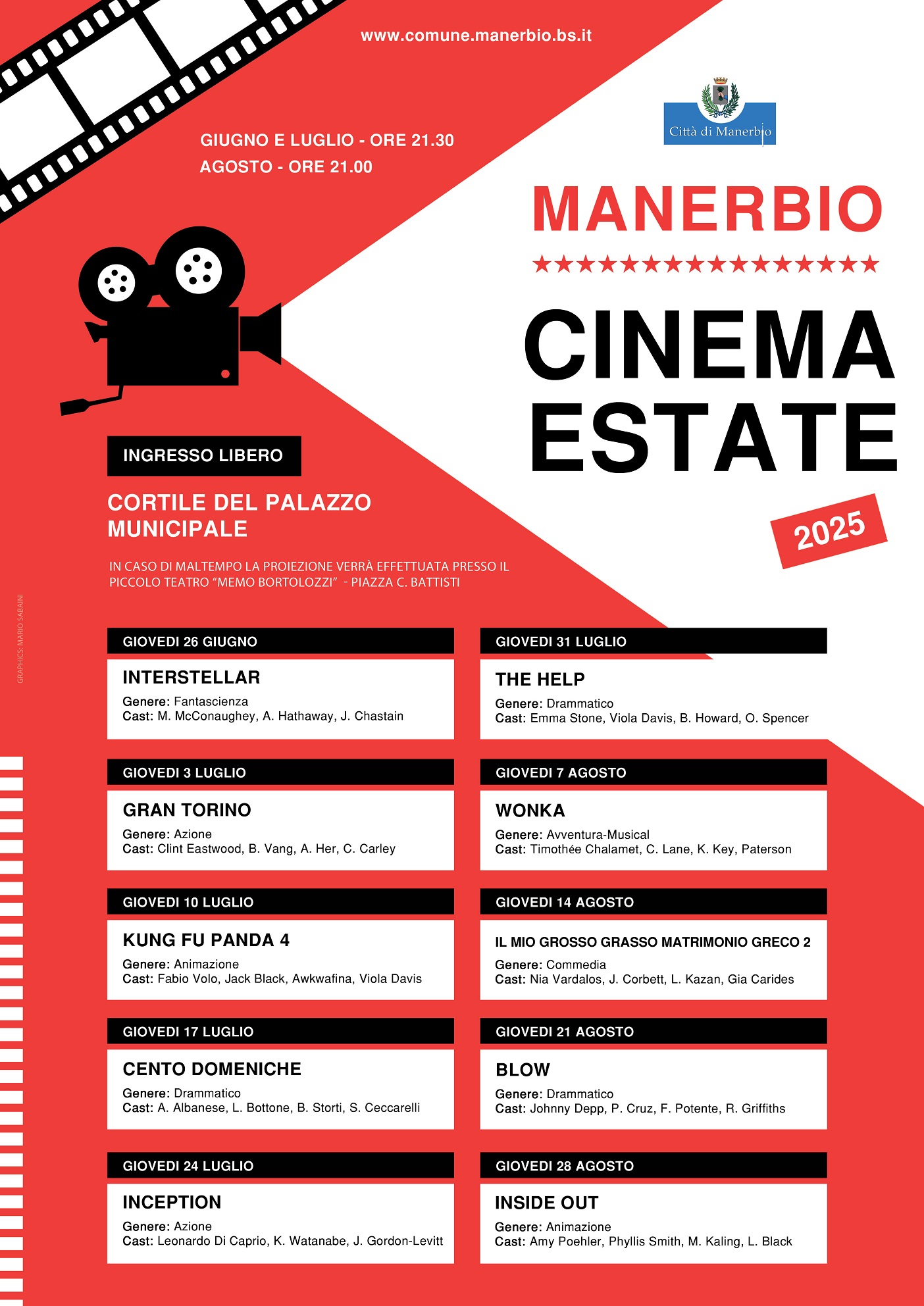 In caso di pioggia la proiezione verrà effettuata presso il Piccolo Teatro "Memo Bortolozzi", in Piazza C. Battisti - Manerbio (BS).