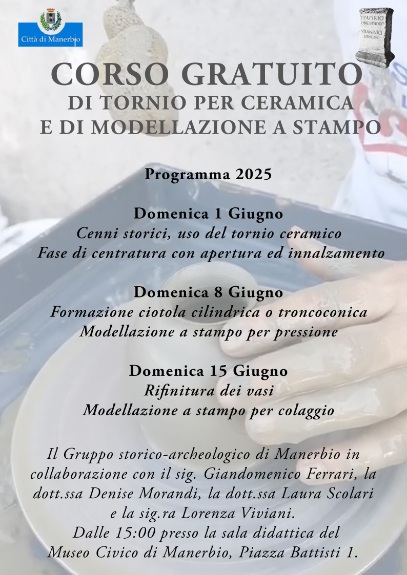 Descrizione Il Gruppo storico-archeologico organizza un corso gratuito di tornio per ceramica e modellazione a stampoDalle ore 15.00 presso la sala didattica del Museo Civico di Manerbio - Piazza C. Battisti, Manerbio (BS)