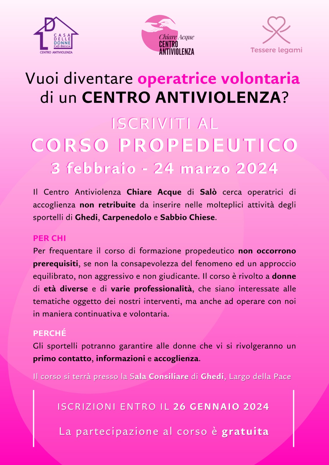 Il corso si terrà presso la Sala Consiliare di Ghedi, Largo della Pace