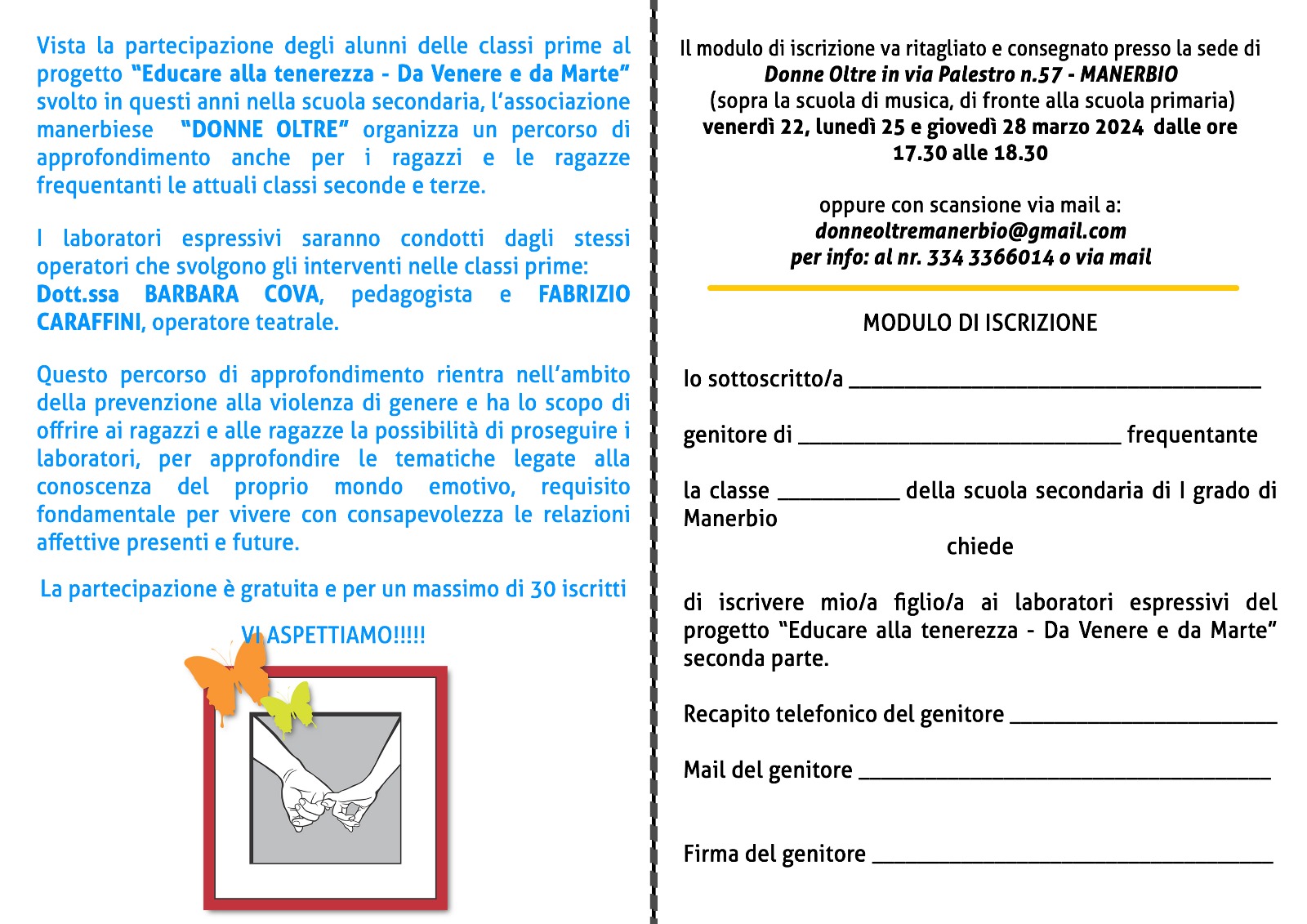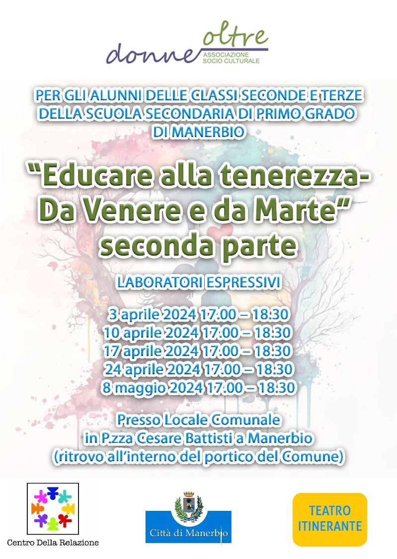 Dalla collaborazione tra l’assessorato alla cultura e l’associazione socioculturale “Donne oltre” ha preso forma un progetto di notevole interesse rivolto in modo specifico agli alunni delle classi seconde e terze della Scuola Secondaria di primo grado manerbiese. Si tratta di laboratori espressivi che sono inseriti in un percorso intitolato “Educare alla tenerezza – Da Venere a Marte”.