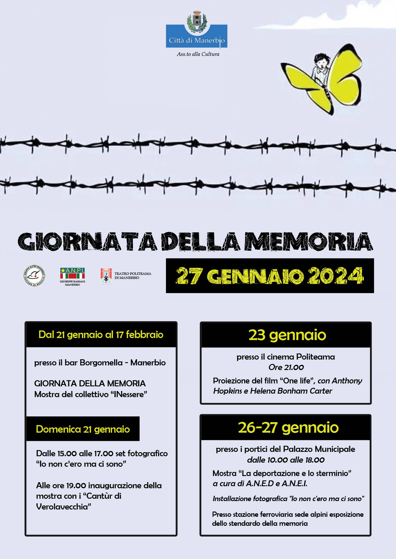 L'amministrazione comunale, in collaborazione con il Gruppo Alpini Manerbio, A.N.P.I e Teatro Politeama, vuole celebrare la Giornata della Memoria con una serie di iniziative artistiche e culturali, per non dimenticare le vittime dell'Olocausto che l'umanità ha vissuto durante la seconda guerra mondiale.