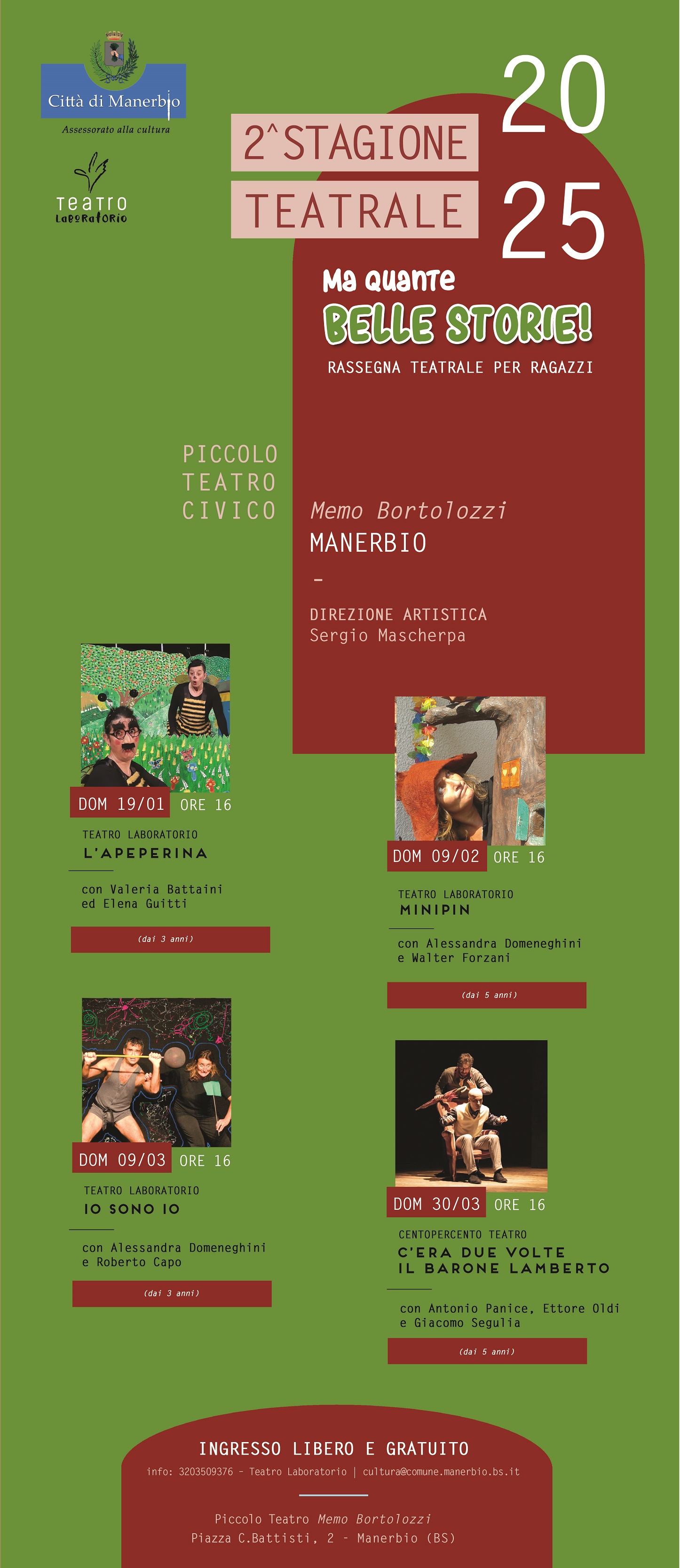 “Ma quante belle storie!” calerà poi il sipario domenica 30 marzo con “C’era due volte il barone Lamberto” che verrà proposto da “Centopercento Teatro”. In questo caso i protagonisti saranno Antonio Panice, Ettore Oldi e Giacomo Segulia che interpreteranno uno spettacolo rivolto espressamente a bambini dai cinque anni d’età.