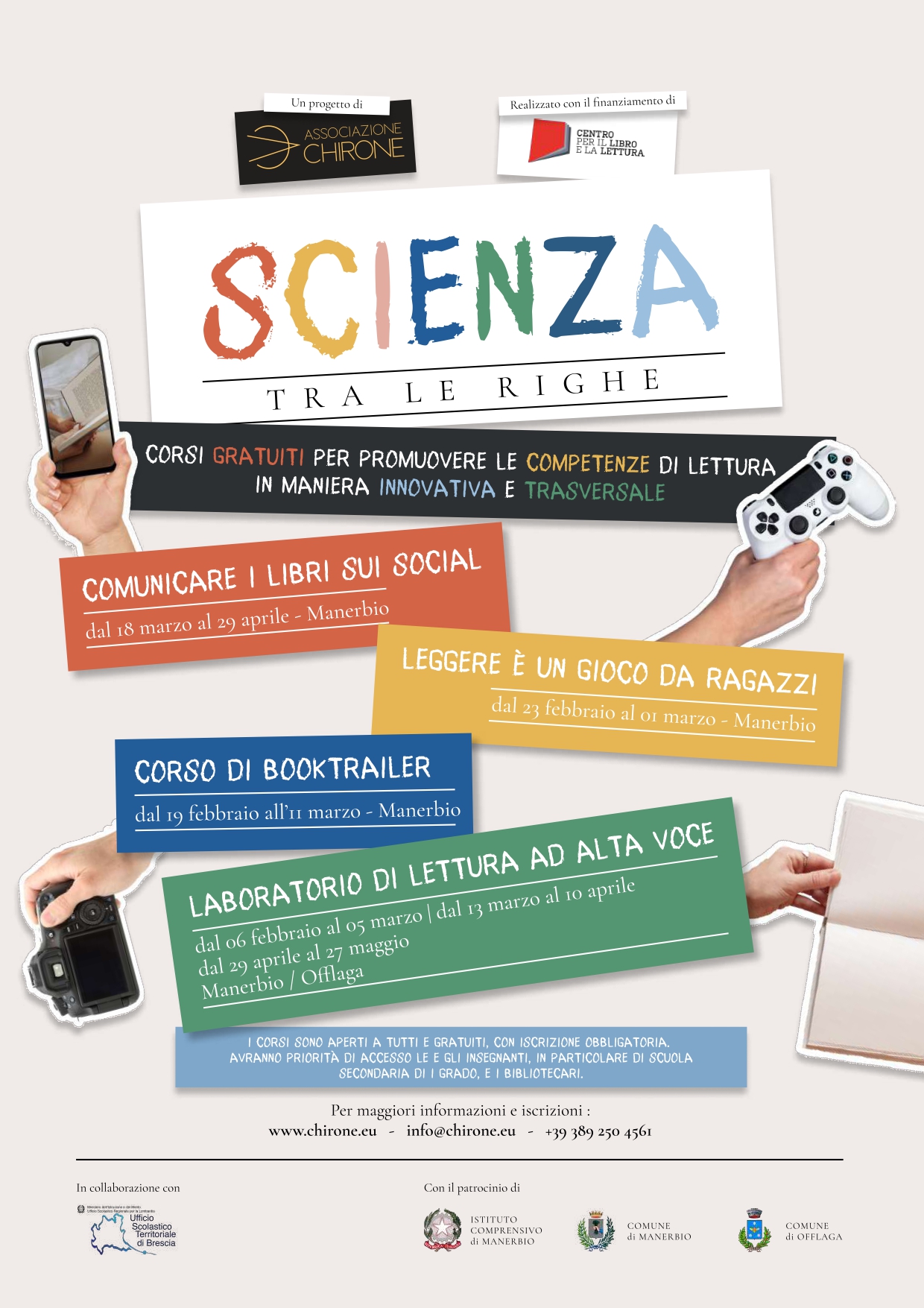 Dal 6 febbraio partono i corsi del progetto "Scienza tra le righe" di cui il Comune di Manerbio è partner. I corsi proveranno a promuovere nuove modalità di approccio alla lettura e alla comprensione del testo attraverso il booktook, il booktrailer, giochi di ruolo, videogame e il teatro.