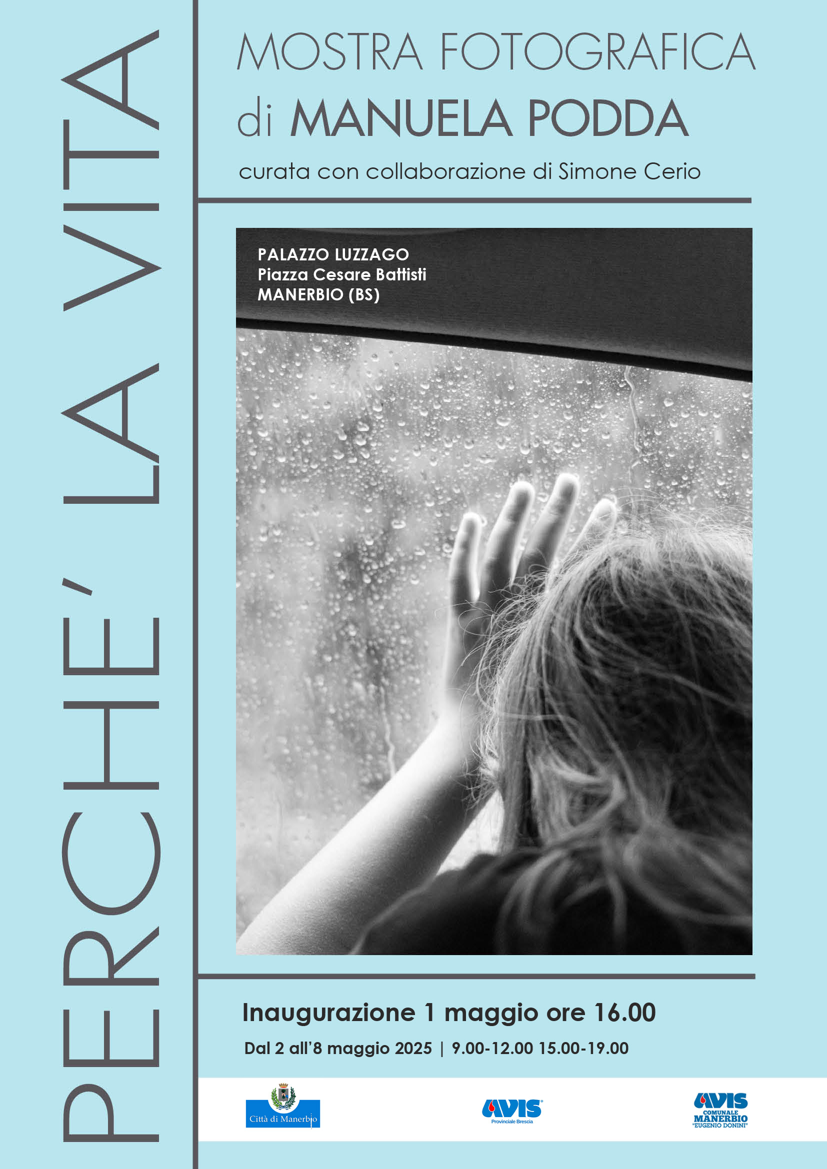 L'Amministrazione comunale, in collaborazione con AVIS Manerbio e AVIS Provinciale Brescia, è lieta di presentare la mostra fotografica "Perché la vita " di Manuela Podda con la collaborazione di Simone Cerio.