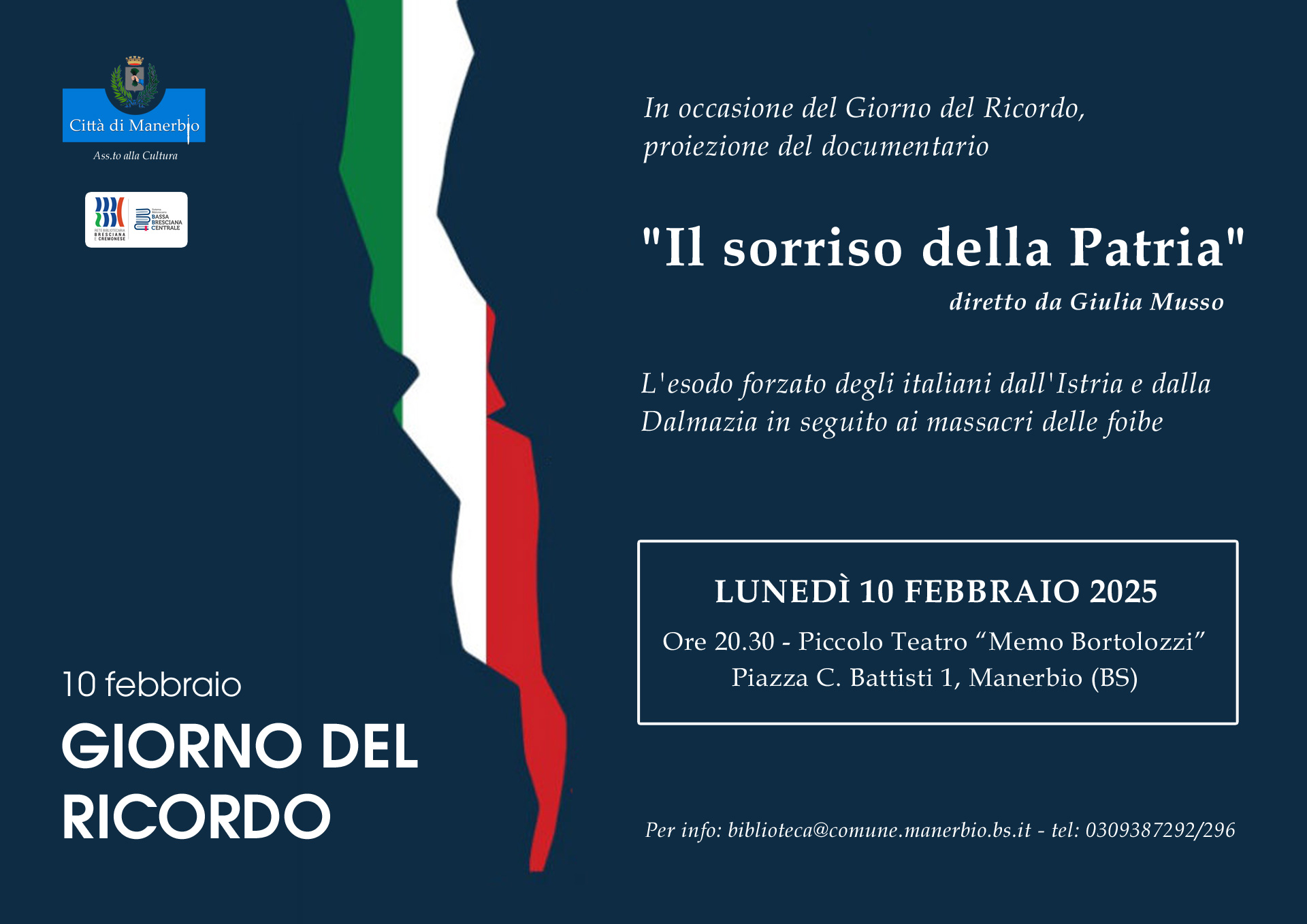 Cos'è In occasione del Giorno del Ricordo proiezione del documentario "Il sorriso della Patria" diretto da Giulia Musso.Un racconto dettagliato dell'esodo forzato degli italiani dall'Istria e dalla Dalmazia in seguito ai massacri delle foibe